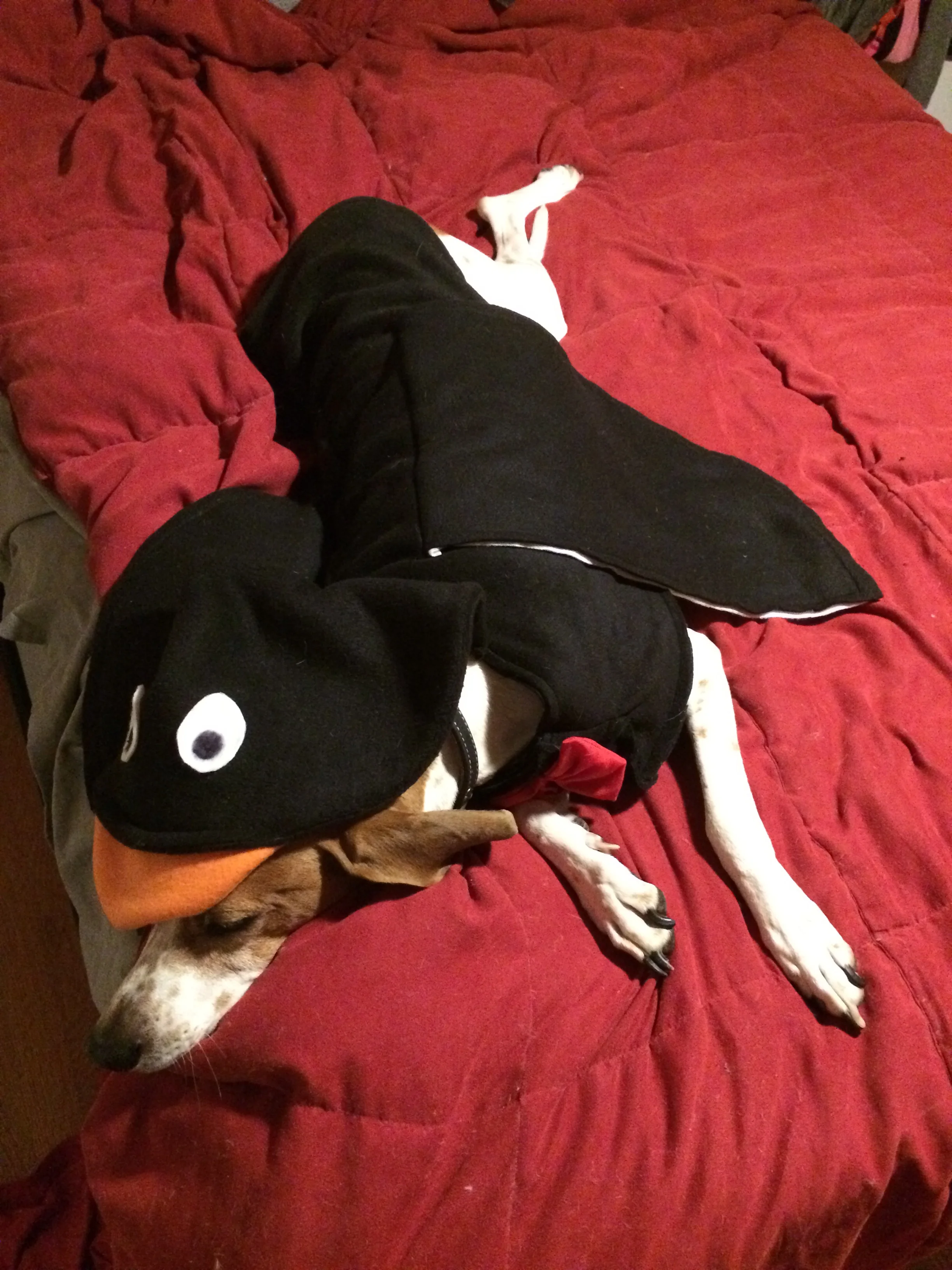 The hood is a half circle, folded in half, and stitched a long the flat side, then attached to the cape part. The beak is just an orange attachment to the top of the hood, and I cut out white circles and drew black dots on them with sharpie for the eyes. I might add a chin strap to keep this in place, because it sort of falls whenever Riker moves. The wings are free-handed, black on one side, white on the other. I attached them to either side of the spine on the cape. I made a small red bow and attached it to the front, since the penguins have red bow ties.