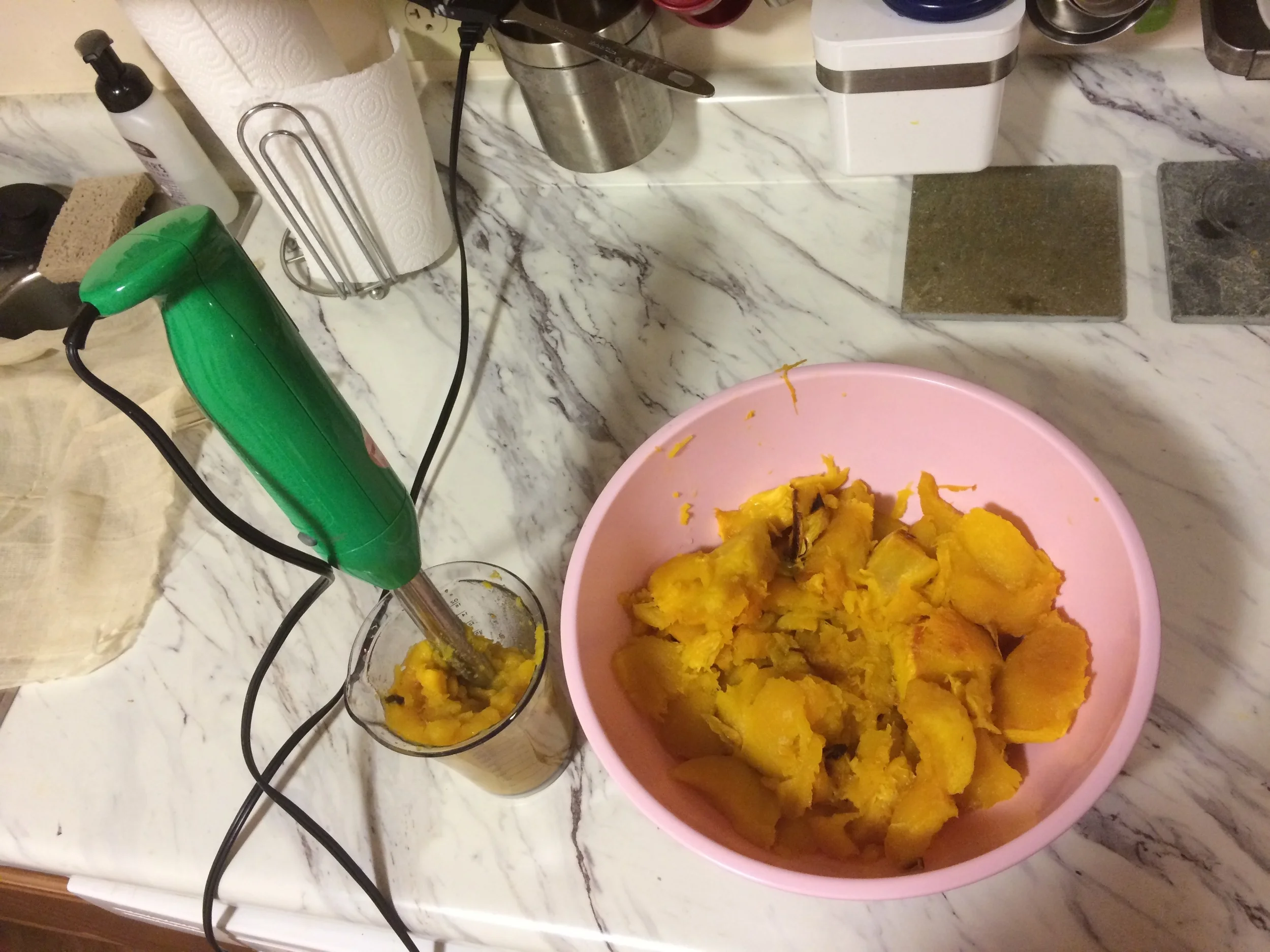We’ve reached that time of year where pumpkins find us around every corner. Whether it be decorations, pies, or lattes, this orange fruit becomes a staple of the season. This year, just before Halloween, we went to Munson Farms here in Boulder and bought four pumpkins. We decided not to carve them this year because we were running short on time, so I quickly painted them with simple designs. However, it seemed like it would be a waste to ONLY use them for decoration, so I decided to purée them.