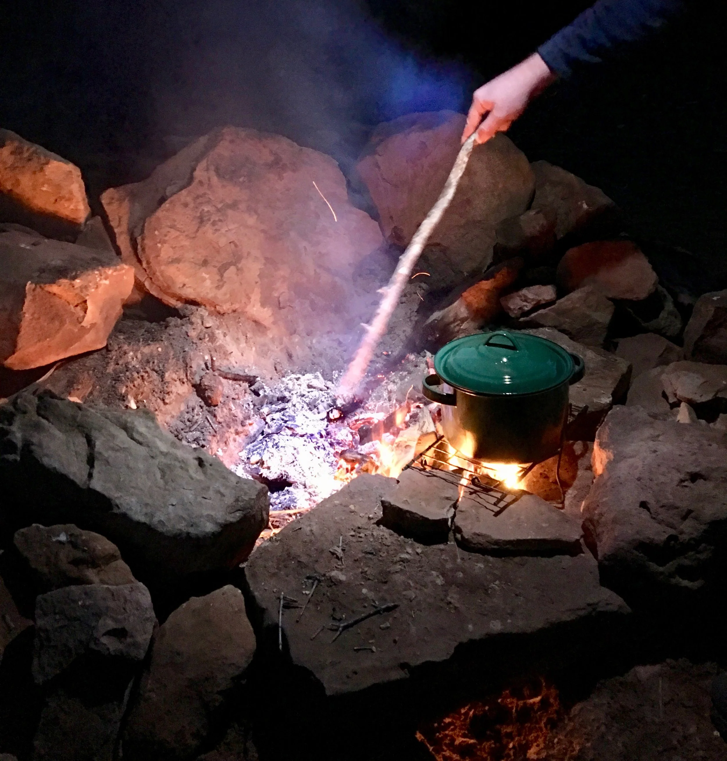 This menu actually was quite reasonable, and didn’t require too much work or gear. To prepare warm food, you can pretty much do everything over the campfire with a wire rack, or you can bring a small propane stove. We have a metal kettle, a cast iron pan and a metal pot that we use to cook. It’s also useful to bring a cutting board and knife.