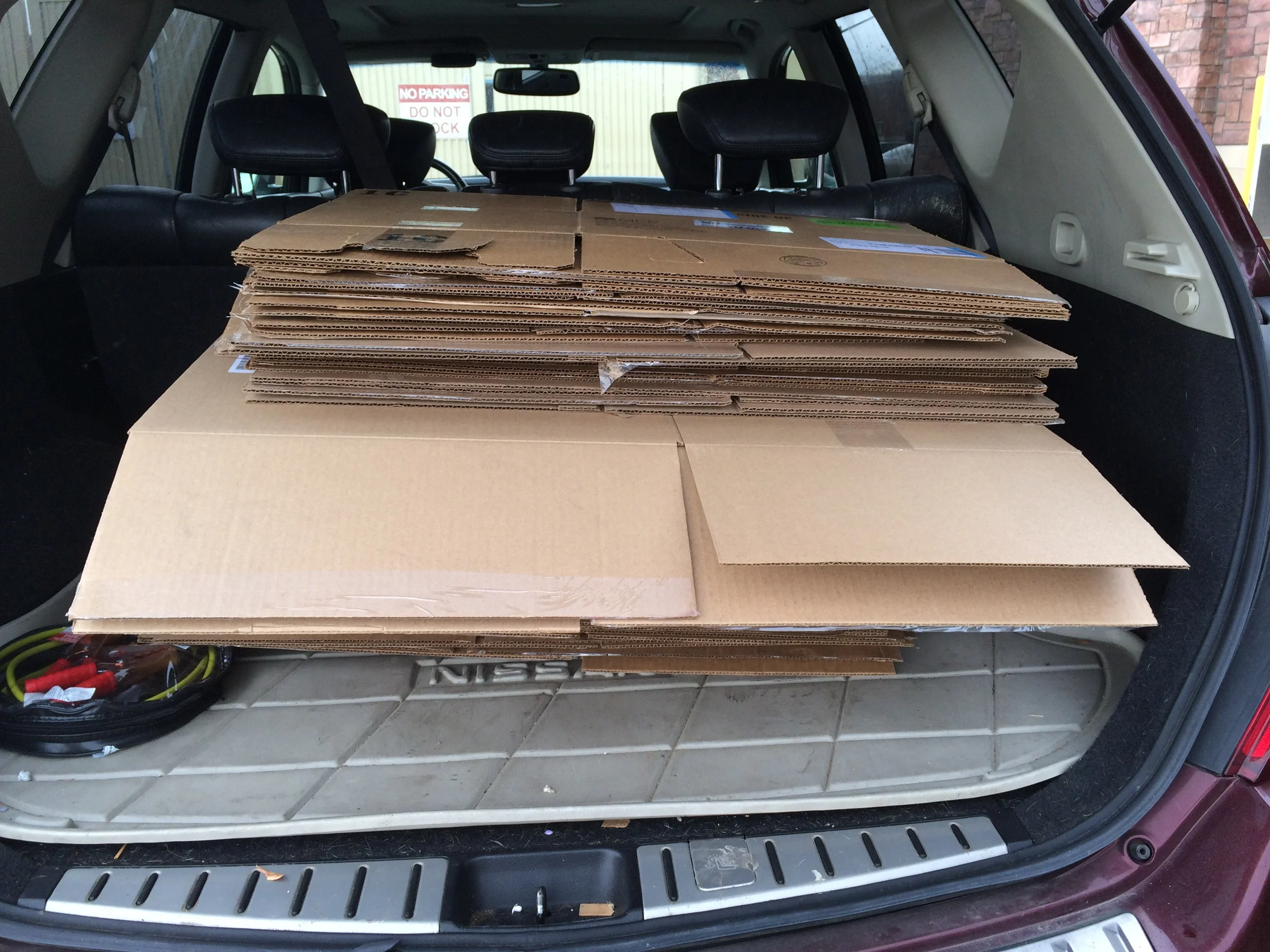 Call upon your friends and family to see if they've got any leftover from a previous move. Other great places to ask are liquor stores and bookstores. We got several that were great for transporting our alcohol collection (which will now live in the bar in the basement!). The biggest haul we got was from Barnes and Noble - I had great timing! They were about to recycle all of them, and they were all broken down, so I got to fit a huge stack in my trunk. We needed to re-use a handful of boxes, so we would have had to find more boxes if we needed to put every single thing in the boxes at the same time, but luckily since we were just going across town, we could unpack a few boxes and bring them back to the condo and load them up again.