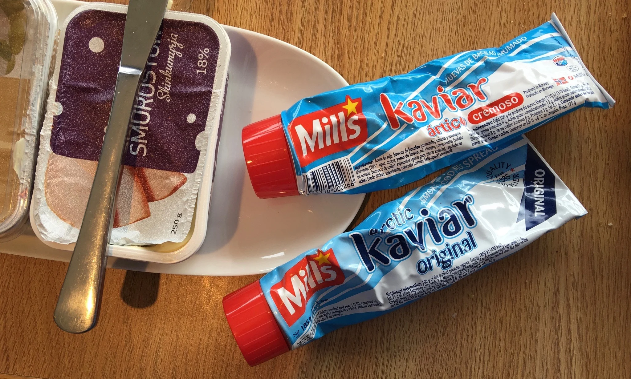 Also, we got to experience an Icelandic continental breakfast at our hotel, where they had meats, cheeses, crackers, cereal, veggies (cucumbers and bell peppers for breakfast? ok), fruit, and... caviar in a tube. Odd, but at least it gave us a literal taste of what's normal on this island.