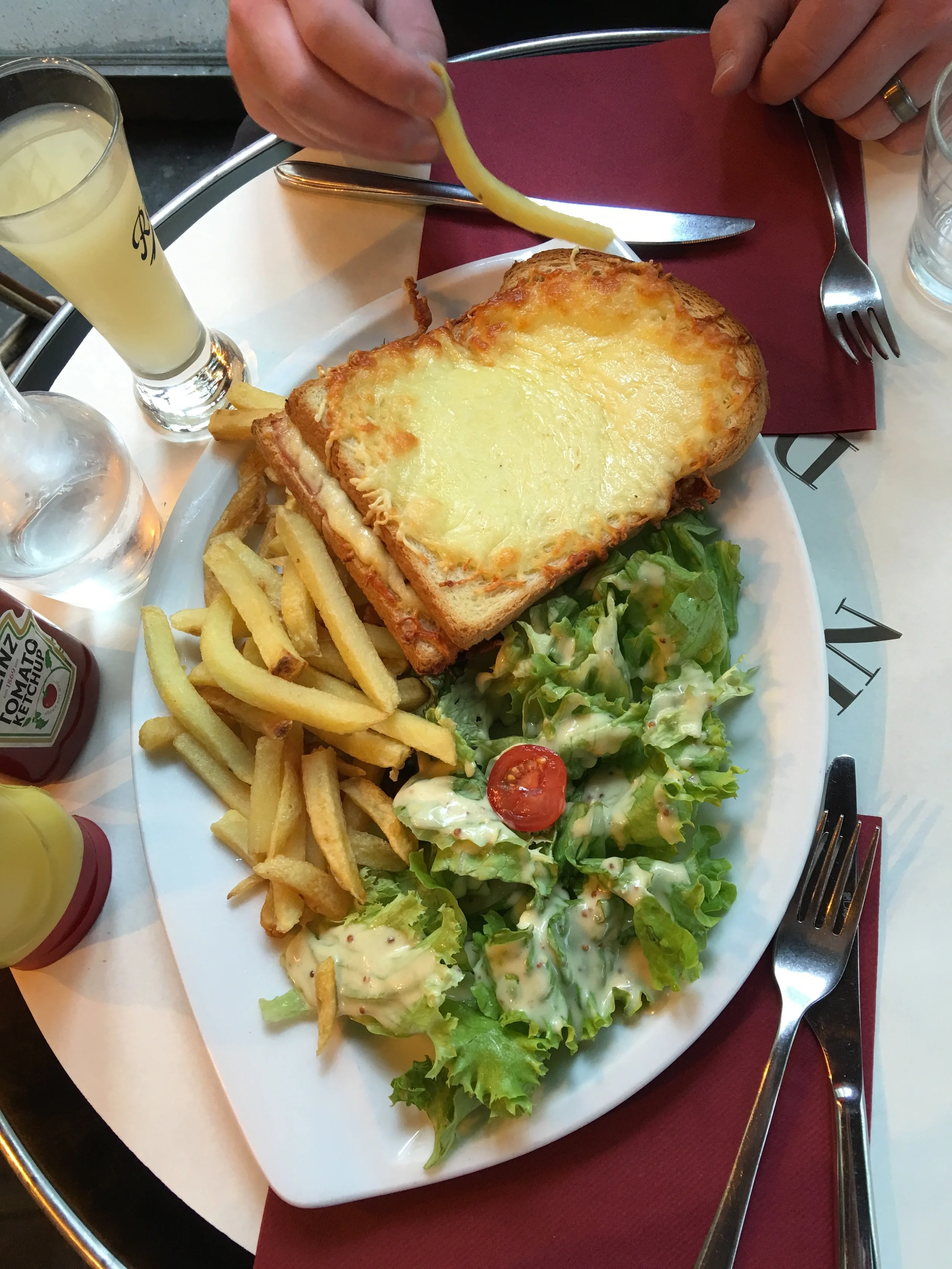 After our ride on the Chunnel and finding our hotel, our first priority was a bite to eat! Super nearby our hotel, we found a cute little restaurant called Cafe D'Augustin where we got to sit outside, and we shared a croque-monsieur. A staple in many French restaurants, this sandwich has ham and melted cheese, and came with frites (fries) and a simple salad. Nathaniel had an apéritif and I had a glass of wine. This perfectly hit the spot before we started exploring.